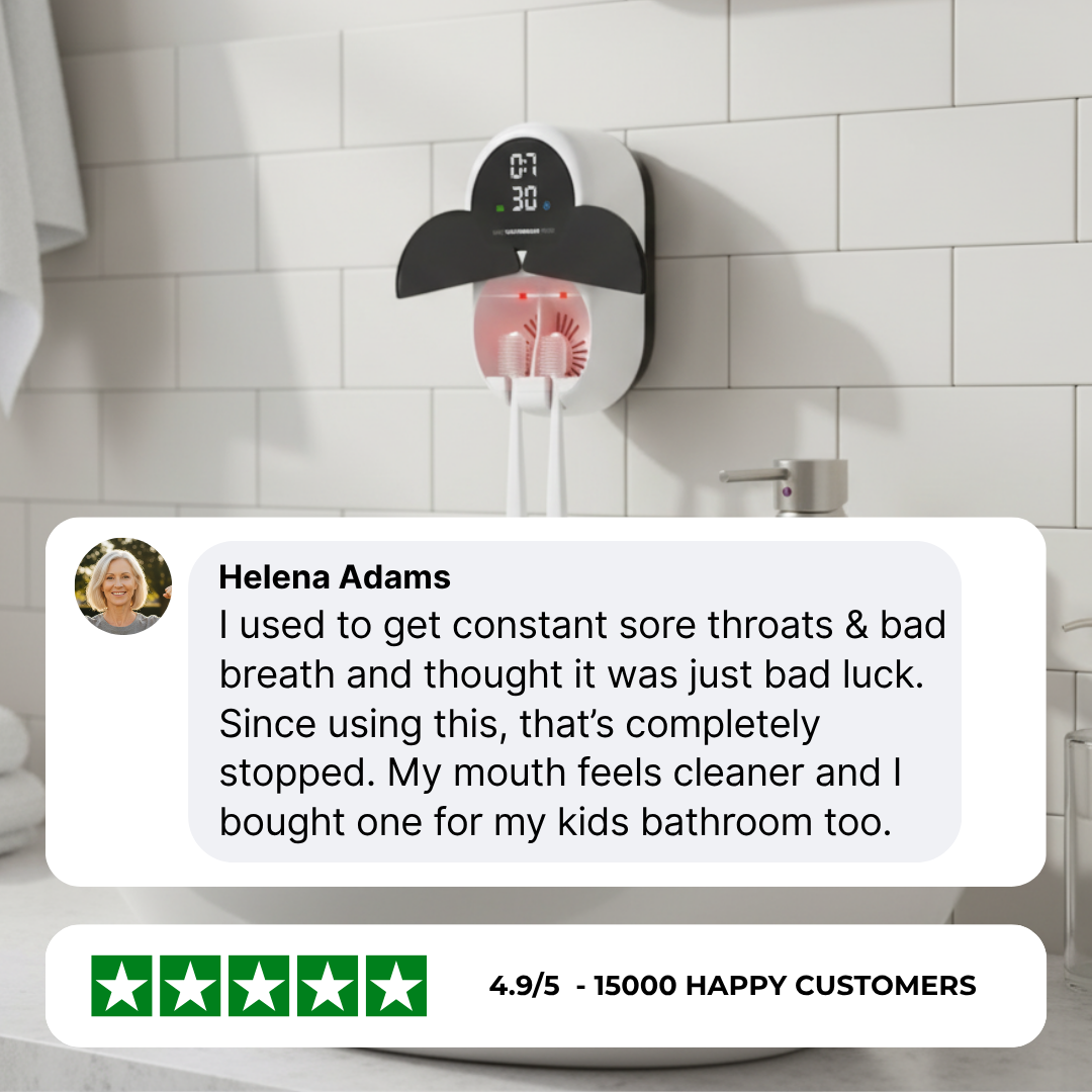 Bad breath often starts with bacteria that live and grow on your toothbrush — especially when it’s left damp after brushing. Each time you use it, those germs transfer straight back into your mouth. Our UV sanitiser uses powerful ultraviolet light to kill up to 99.9% of those bacteria, viruses, and microbes in just a few minutes. The result? A cleaner brush, a healthier mouth, and noticeably fresher breath that lasts all day.