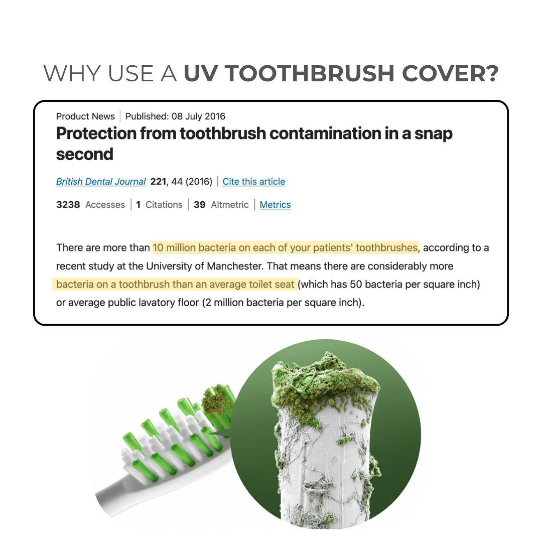 Every time you brush with a contaminated toothbrush, you risk reintroducing harmful bacteria and viruses into your body — the same ones that can cause sore throats, mouth infections, and even colds. By sterilising your toothbrush after every use, the UV light eliminates up to 99.9% of those invisible germs before they reach your mouth. Over time, that means fewer bugs spreading through your home, stronger immune protection for your family, and fewer costly trips to the doctor or dentist.
